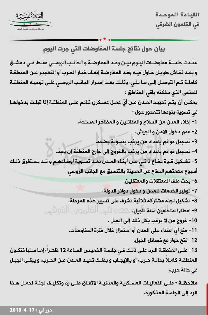 أصدرت القيادة الموحدة للجيش السوري الحر في القلمون الشرقي، بيانا، تحدثت فيه عن تفاصيل المفاوضات الحاصلة بين القيادة الموحدة من طرف ونظام الأسد وروسيا من طرف بخصوص التوصل لاتفاق حول مصير المناطق التي يسيطر عليها الجيش الحر.