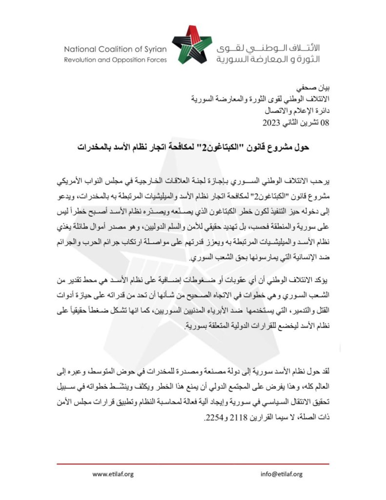 الائتلاف الوطني يرحب بالمشروع الأمريكي “الكبتاغون2”