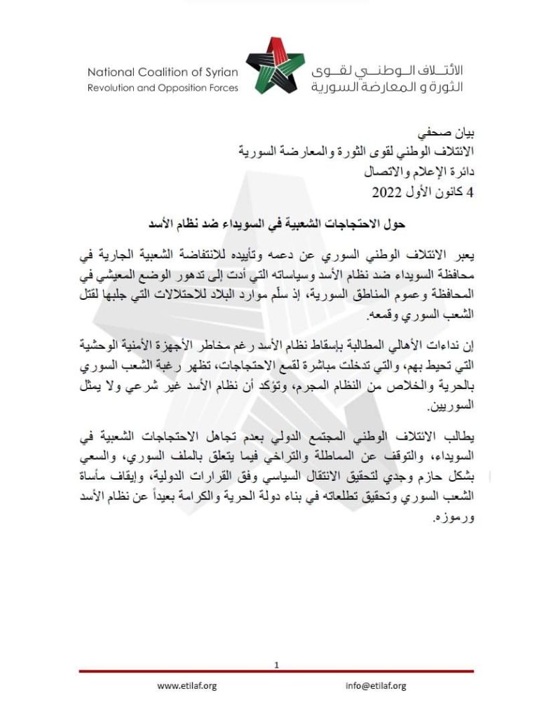 جاء ذلك خلال بيان صحفي أصدره الائتلاف الوطني لقوى الثورة والمعارضة السورية يوم الامس الاحد المصادف 4 كانون الأول 2022حول الاحتجاجات الشعبية في السويداء ضد نظام الأسد .