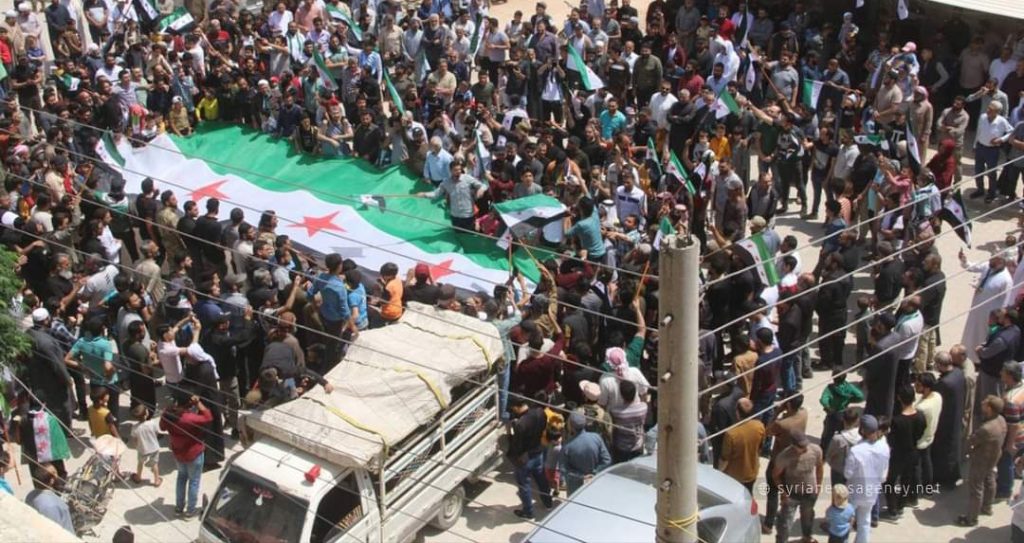 مظاهرات تجتاح الشمال السوري المحرر رفضا لإعادة المجرم بشار الأسد إلى الجامعة العربية.