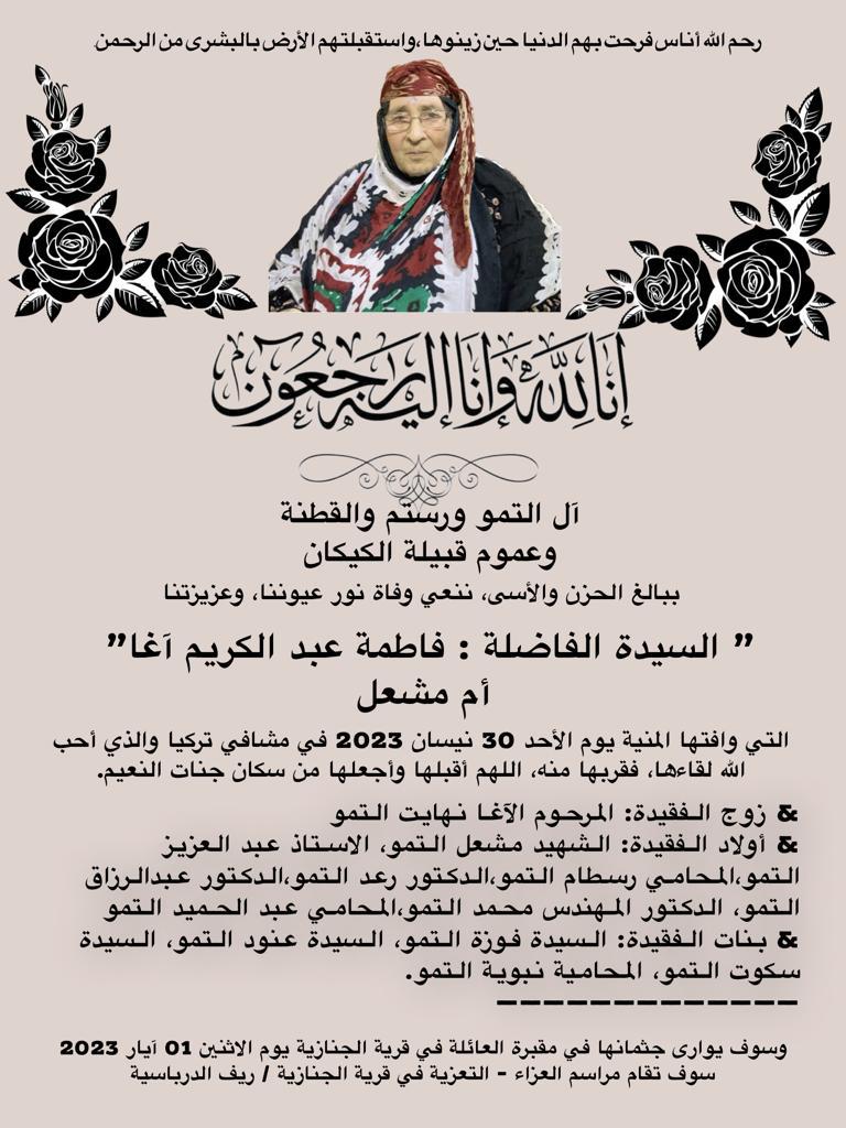 ببالغ الحزن والأسى تلقينا نبأ وفاة السيدة فاطمة عبدالكريم آغا والدة الشهيد مشعل التمو ووالدة الأخ والزميل عبدالعزيز التمو رئيس رابطة المستقلين الكرد السوريين رحمها الله وطيب ثراها وأسكنها جنات النعيم وألهم ذويها الصبر والسلوان.